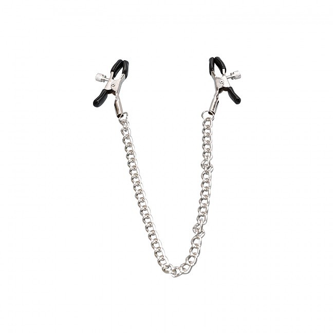 - Зажимы для сосков соединены между собой цепочкой длиной 31 см. Оба зажима имеют смягчающие накладки, а также регуляторы давления.